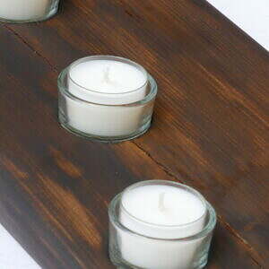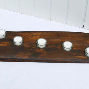 Entdecke unseren einzigartigen Teelichthalter aus einem alten Holzbrett, welcher Platz für 5 Teelichter bietet. Das Altholz wurde sorgfältig geschliffen und im Anschluss mit dunkler Holzbeize bearbeitet, um einen natürlichen und individuellen Look zu erzielen. Die Teelichtgläser sind perfekt in das Holz eingelassen und sorgen für eine gemütliche Atmosphäre in Ihrem Zuhause. Dieser Teelichthalter ist nicht nur ein praktisches Wohnaccessoire, sondern auch ein echter Blickfang. Holen Sie sich jetzt diesen besonderen Teelichthalter und verleihen Sie Ihrem Raum eine rustikale Note.